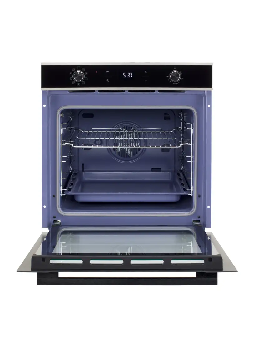Электрический духовой шкаф черного цвета с элегантными вставками из нержавеющей стали и внутренним объемом 75 литров станет стильным и функциональным решением для вашей кухни.