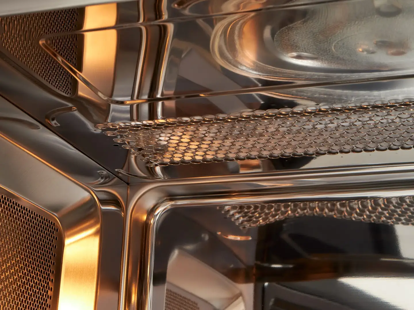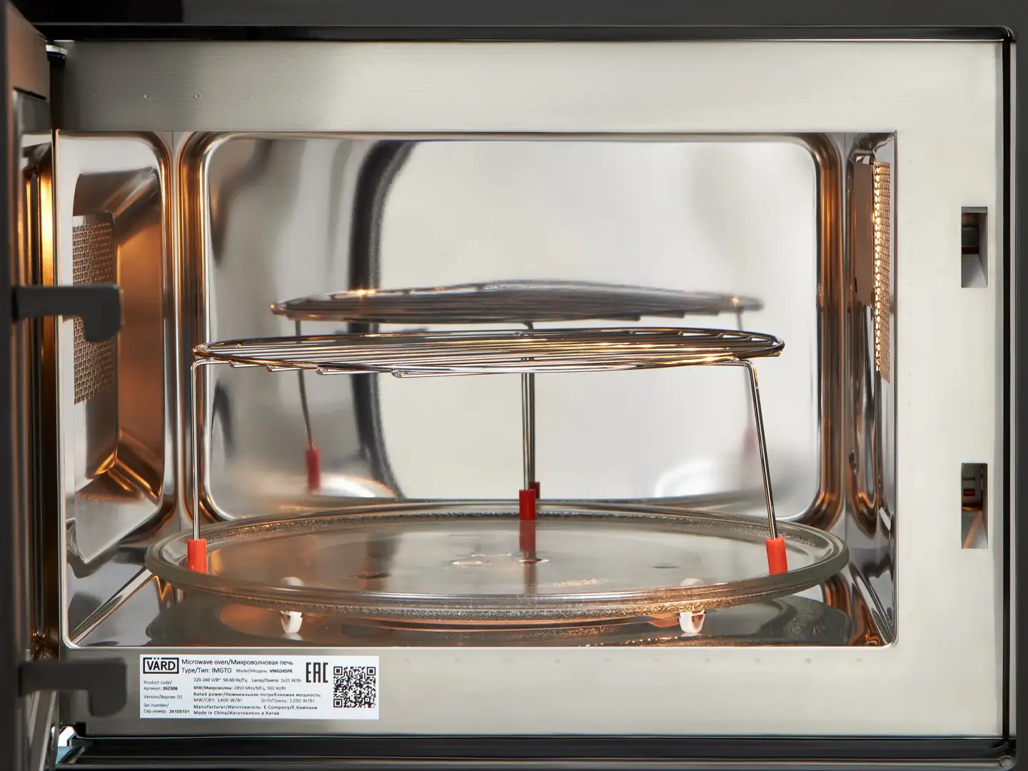 Нержавеющая сталь — безопасный и экологичный материал, который не впитывает посторонние запахи и не подвержен сколам. В такой камере равномернее распределяются микроволны, что позволяет ускорить процессы разогрева или приготовления блюд.