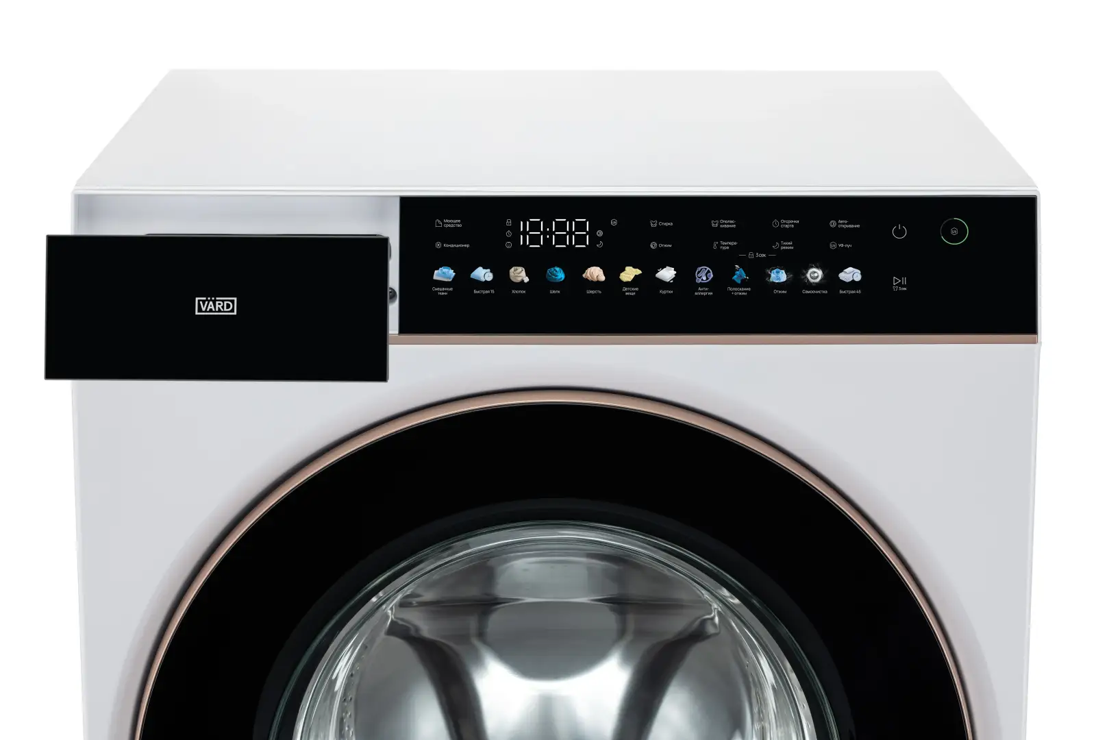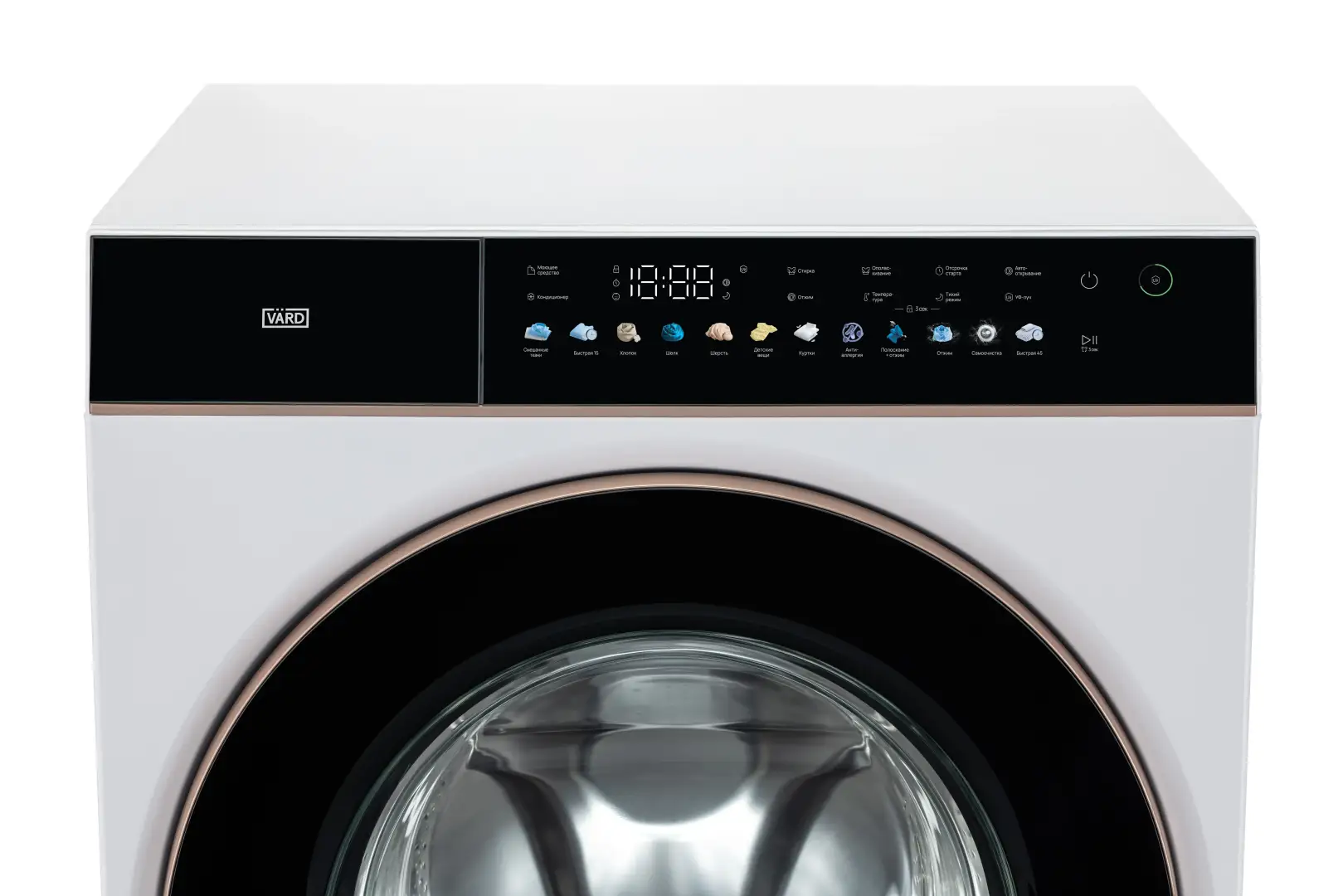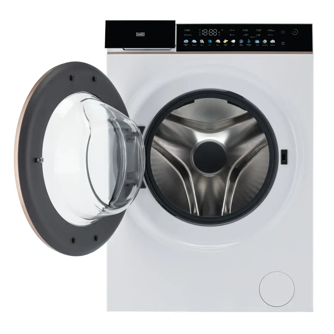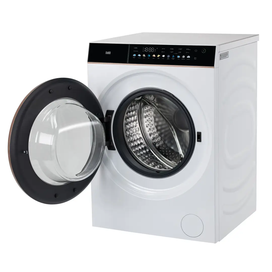 Стиральная машина белого цвета с эксклюзивной медной отделкой обладает максимальной загрузкой 10 кг и скоростью отжима 1400 об/мин и сочетает в себе стильный лаконичный дизайн и большую вместительность.