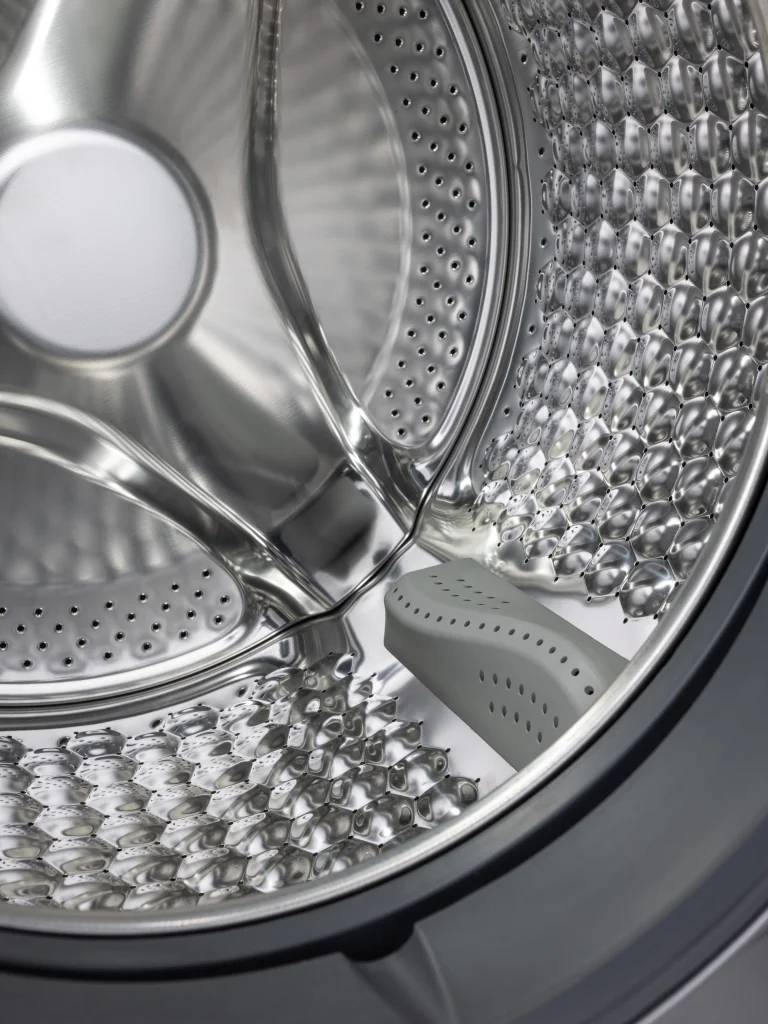 Гладкое покрытие и особая, выпуклая форма внутренней поверхности барабана стиральной машины снижают воздействие на одежду в процессе стирки: на вещах не остаётся зацепок, они меньше изнашиваются.