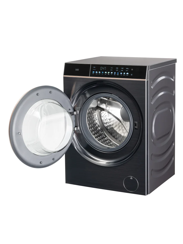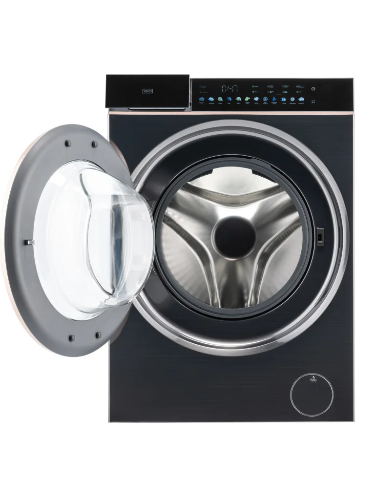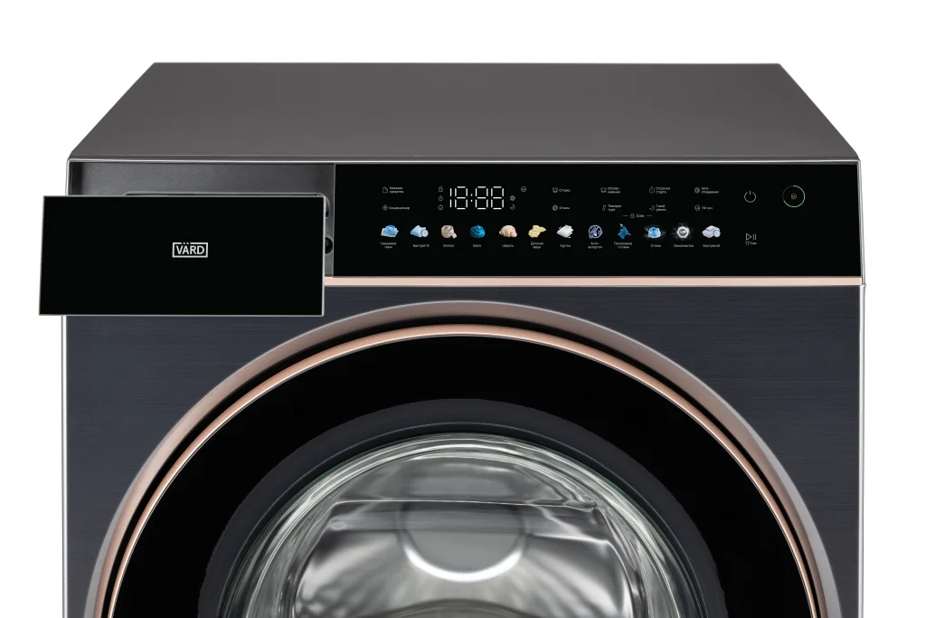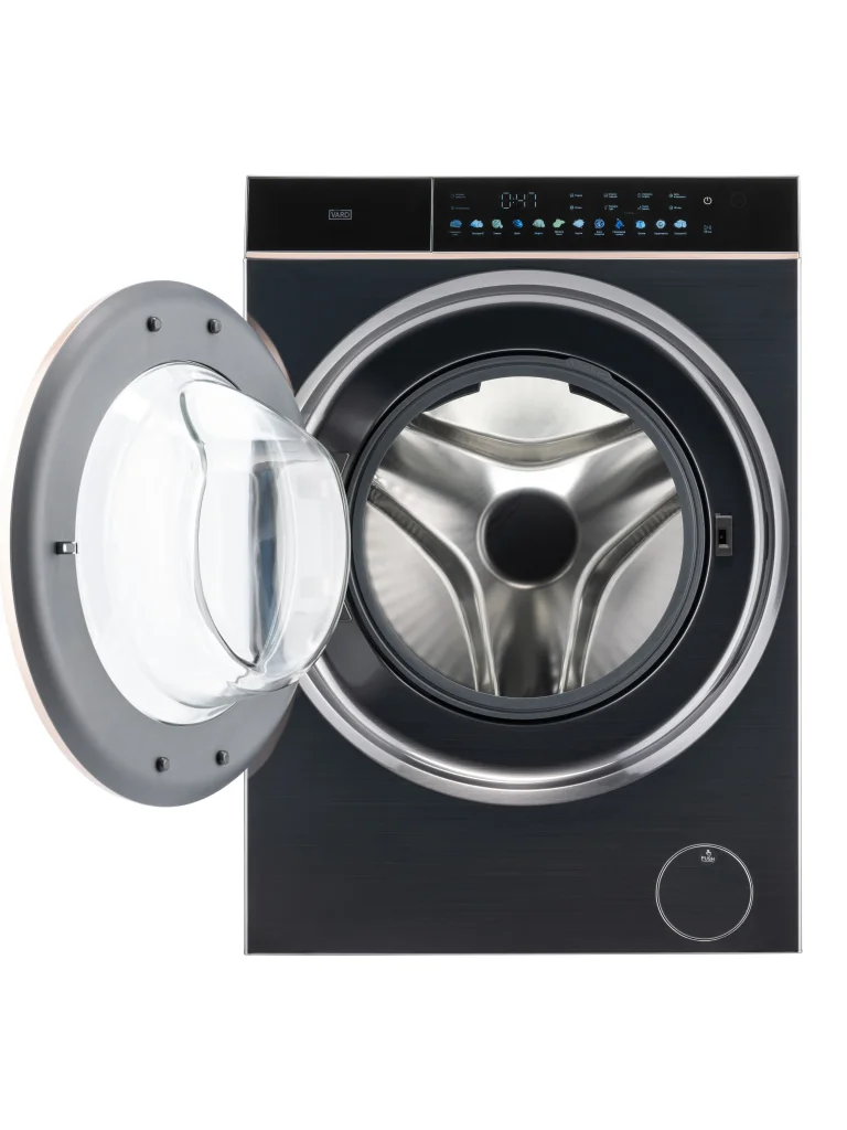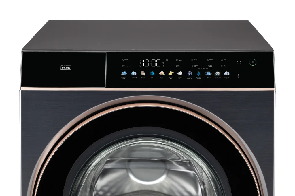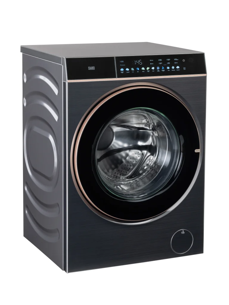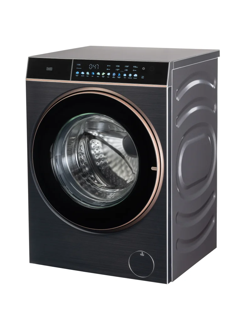 Стиральная машина серого цвета с эксклюзивной медной отделкой обладает максимальной загрузкой 10 кг и скоростью отжима 1400 об/мин и сочетает в себе стильный лаконичный дизайн и большую вместительность.