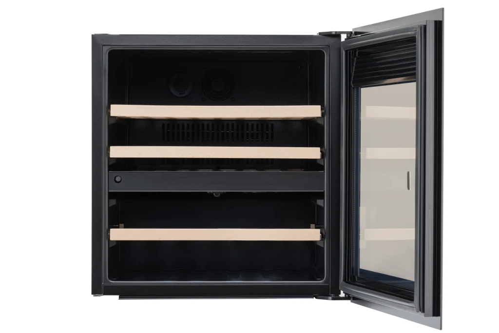 Компрессорный винный шкаф вместимостью 36 бутылок в лаконичном дизайне из черного стекла