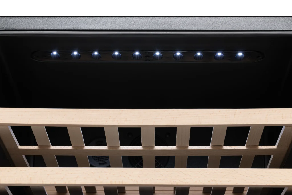 Вино чувствительно к УФ-излучению и может утратить свои качества после воздействия ультрафиолета. Стекло дверцы имеет специальное покрытие, которое не пропускает УФ-лучи, обеспечивая сохранность вашего вина.