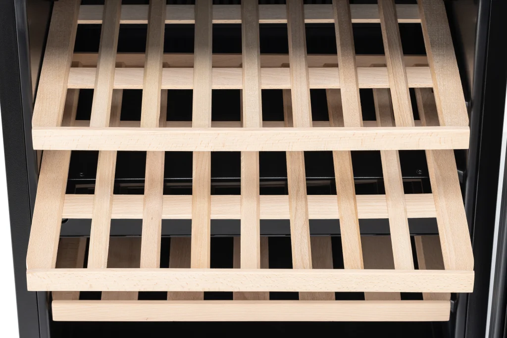 Благодаря особому расположению верхней полки винный шкаф позволяет разместить бутылки игристых вин или шампанского, которые отличаются более широким дном.
