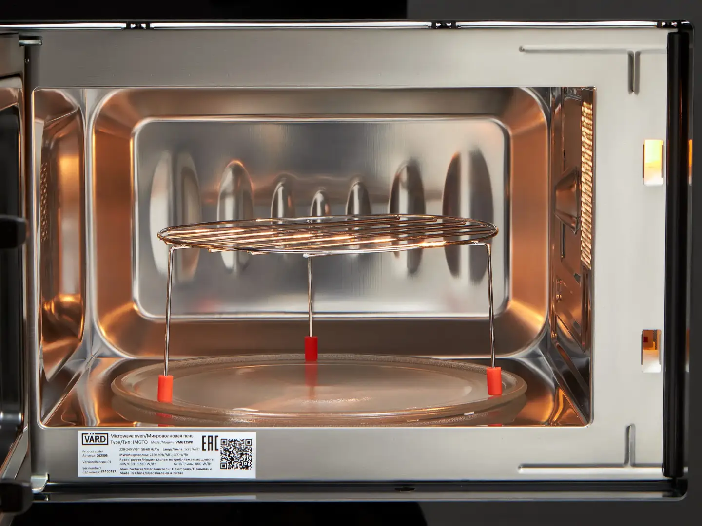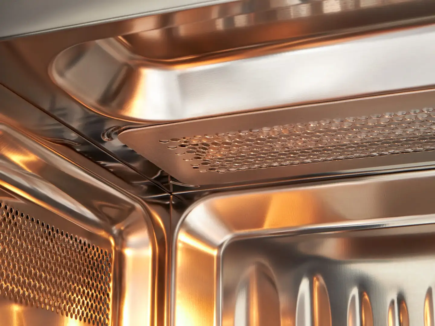 Нержавеющая сталь — безопасный и экологичный материал, который не впитывает посторонние запахи и не подвержен сколам. В такой камере равномернее распределяются микроволны, что позволяет ускорить процессы разогрева или приготовления блюд.