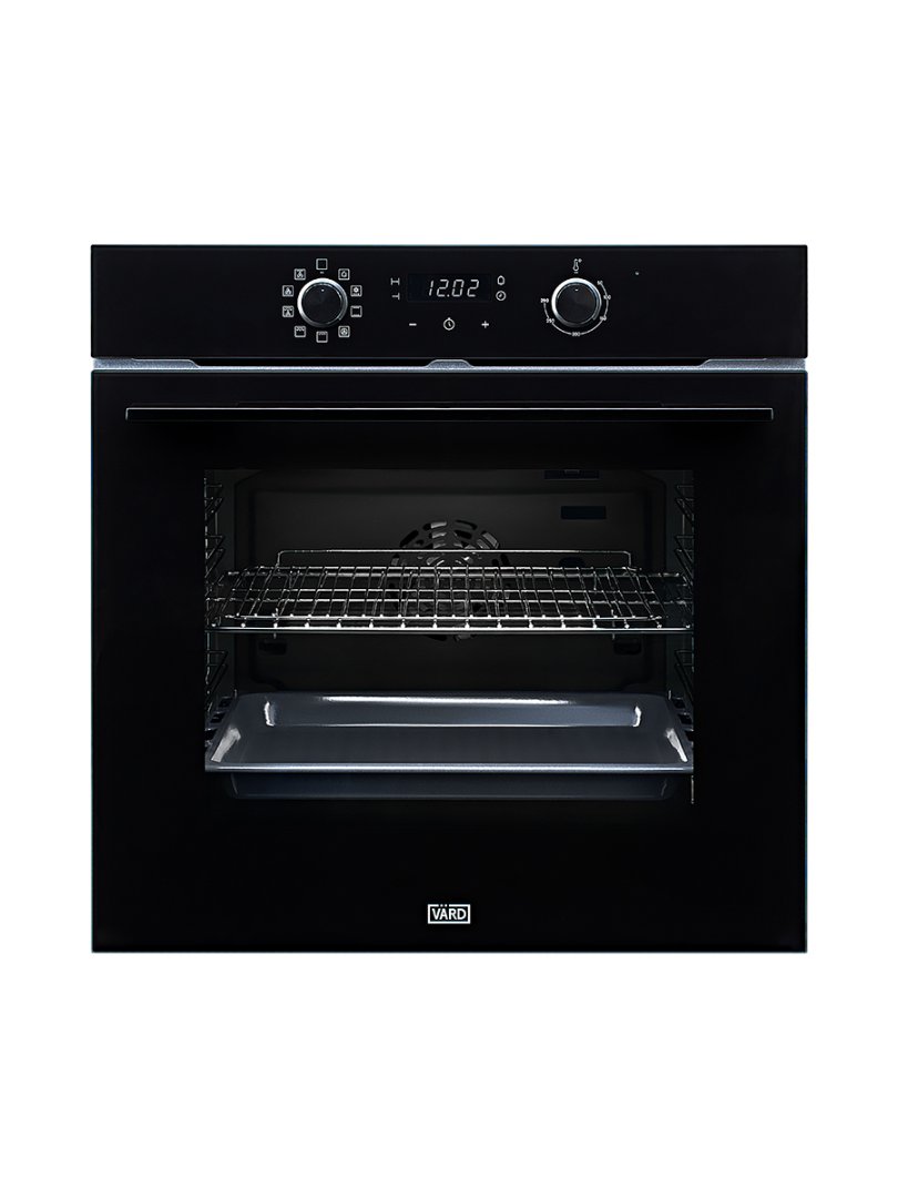Черный встраиваемый духовой шкаф для современной кухни. Каталитическая очистка избавит от утомительного ухода за прибором, телескопические направляющие обеспечат удобство взаимодействия с блюдом, а нагрев 290 градусов позволит готовить пиццу как в печи