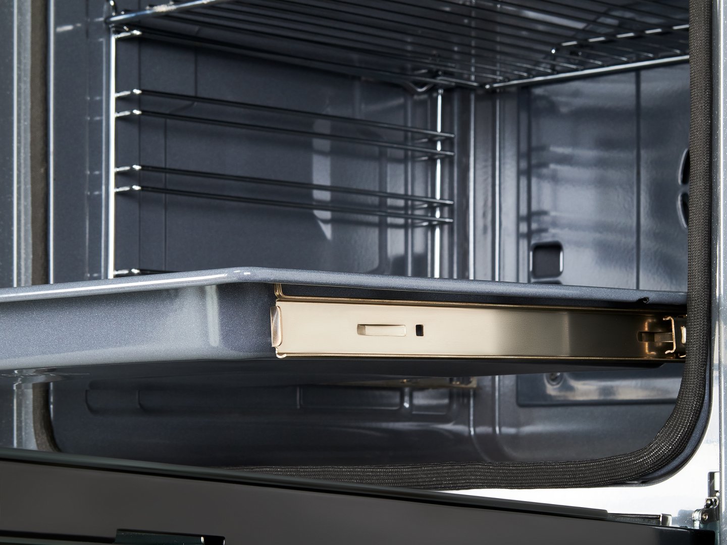 Телескопические направляющие позволяют удобно, одной рукой выдвинуть противень с готовящейся пищей, например чтобы перевернуть её, полить соусом или достать блюдо после приготовления.