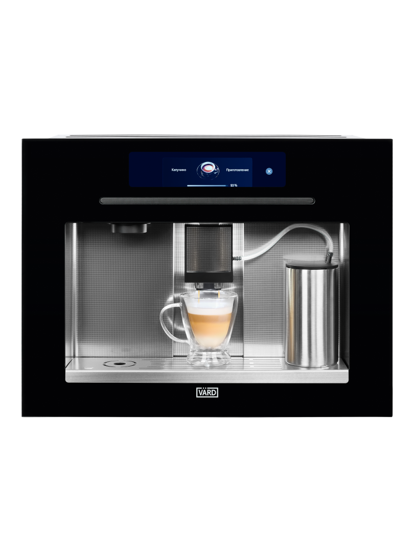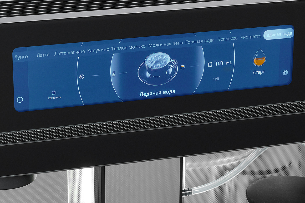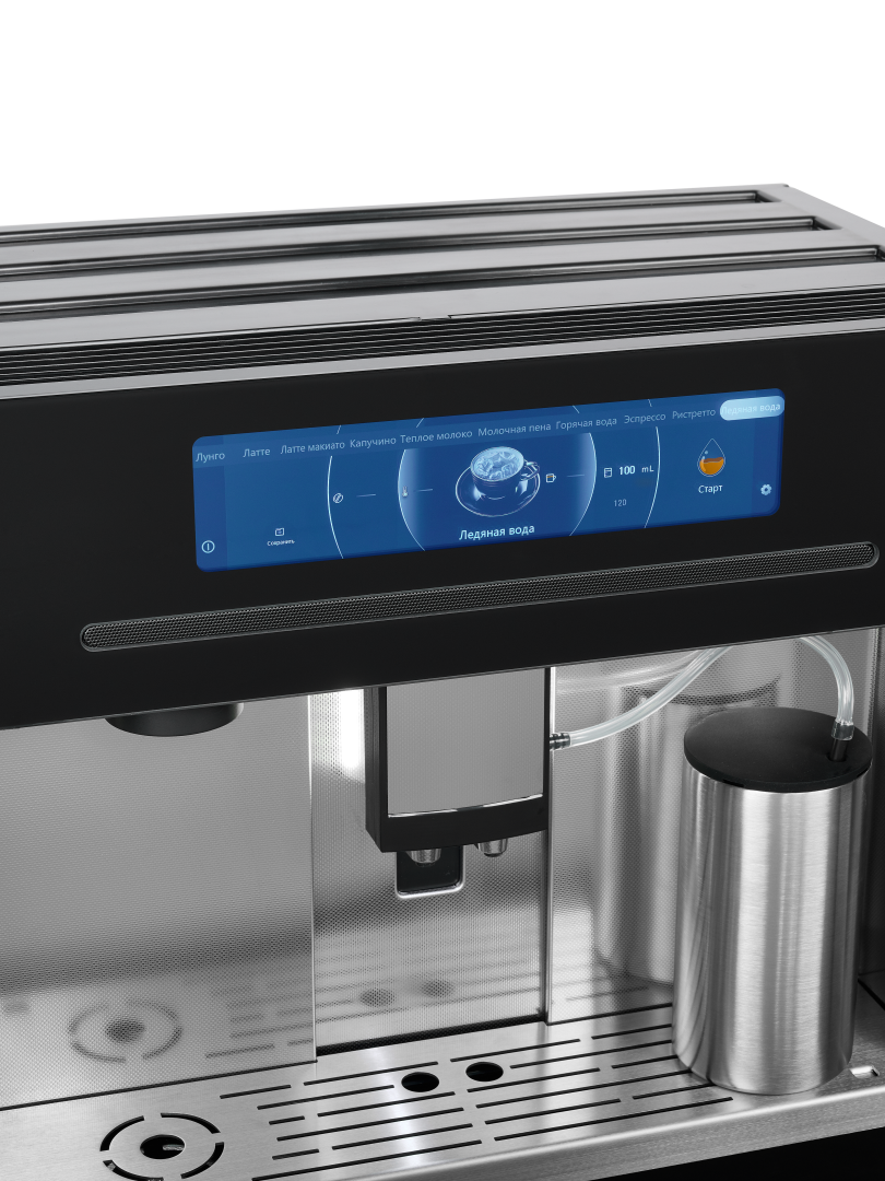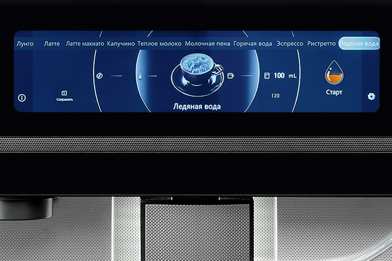 Интуитивно понятная сенсорная панель на русском языке предлагает десять вариантов напитков и позволяет точно настроить крепость, объем и температуру кофе.