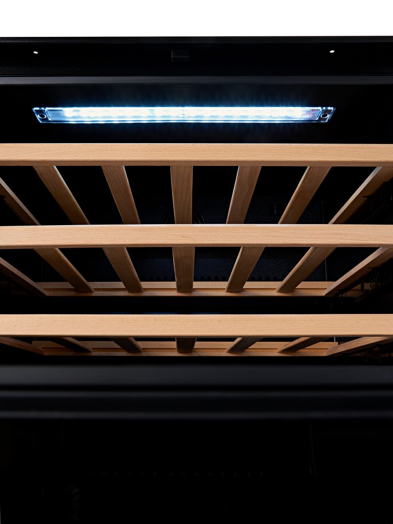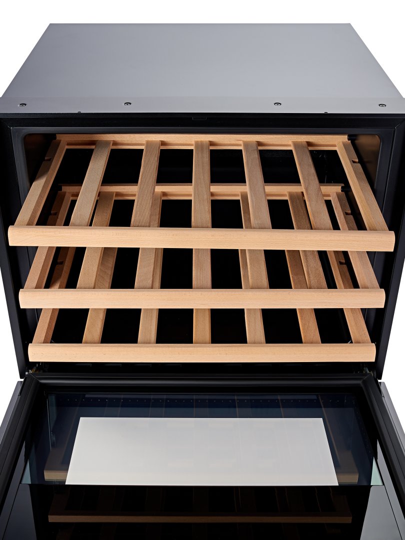 Система хранения в винном шкафу разработана таким образом, чтобы в нём можно было разместить большое количество бутылок — до 24. Две деревянные полки, переставляемые по высоте, а также специальные выемки в дне винного шкафа обеспечивают эргономичное хранение.