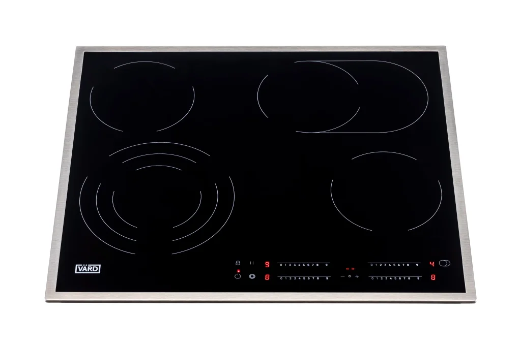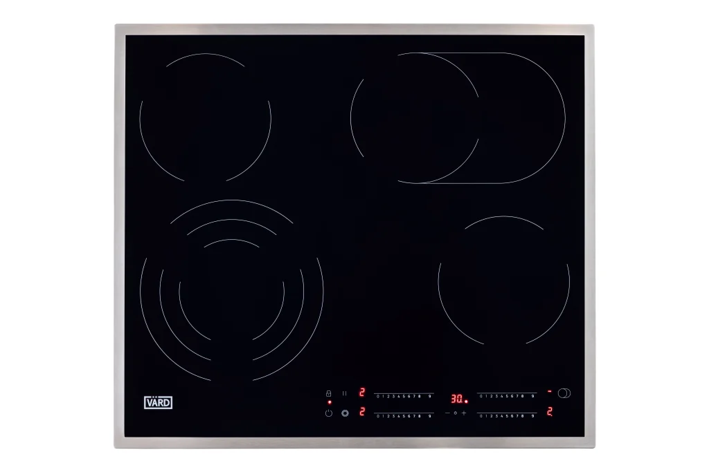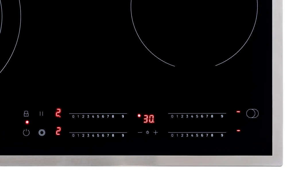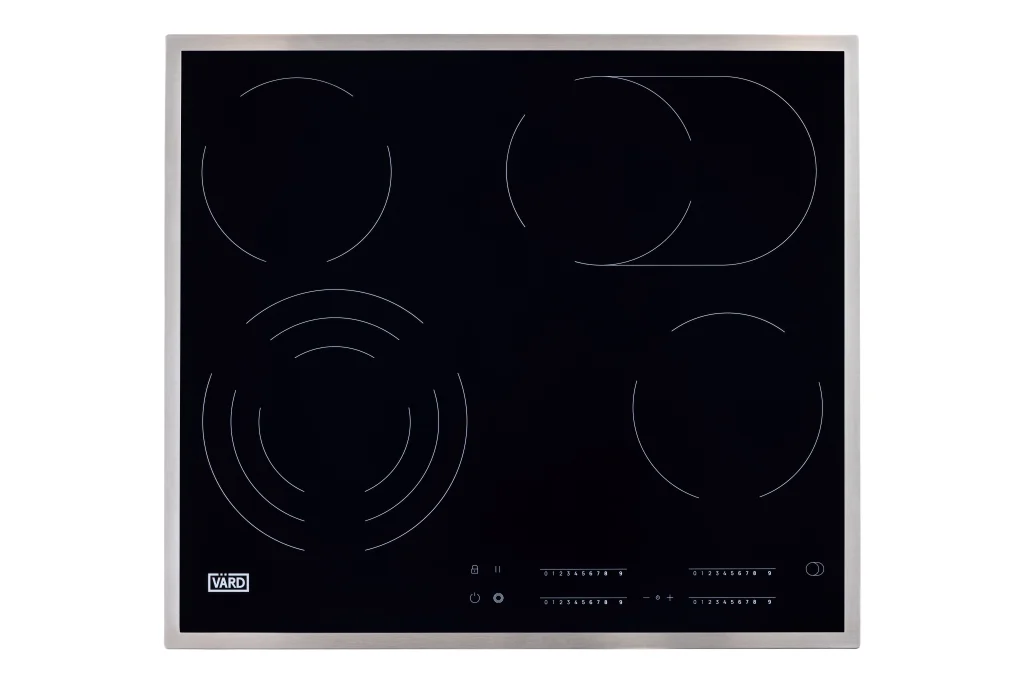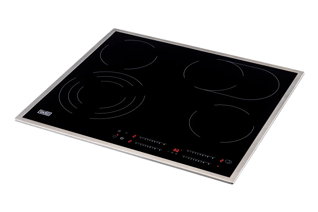 Встраиваемая стеклокерамическая электрическая варочная панель черного цвета и рамкой из нержавеющей стали станет стильным и практичным решением для вашей кухни
